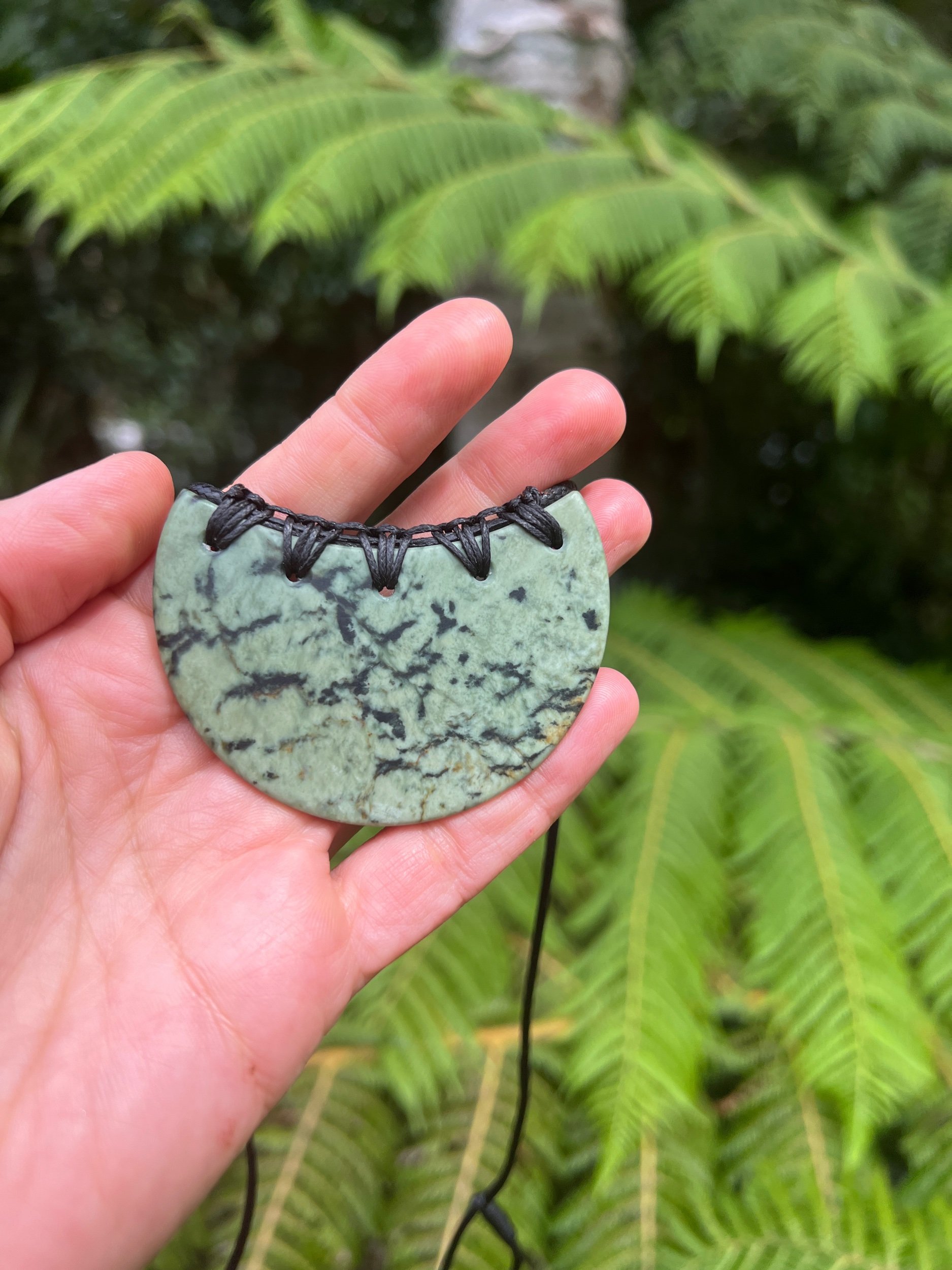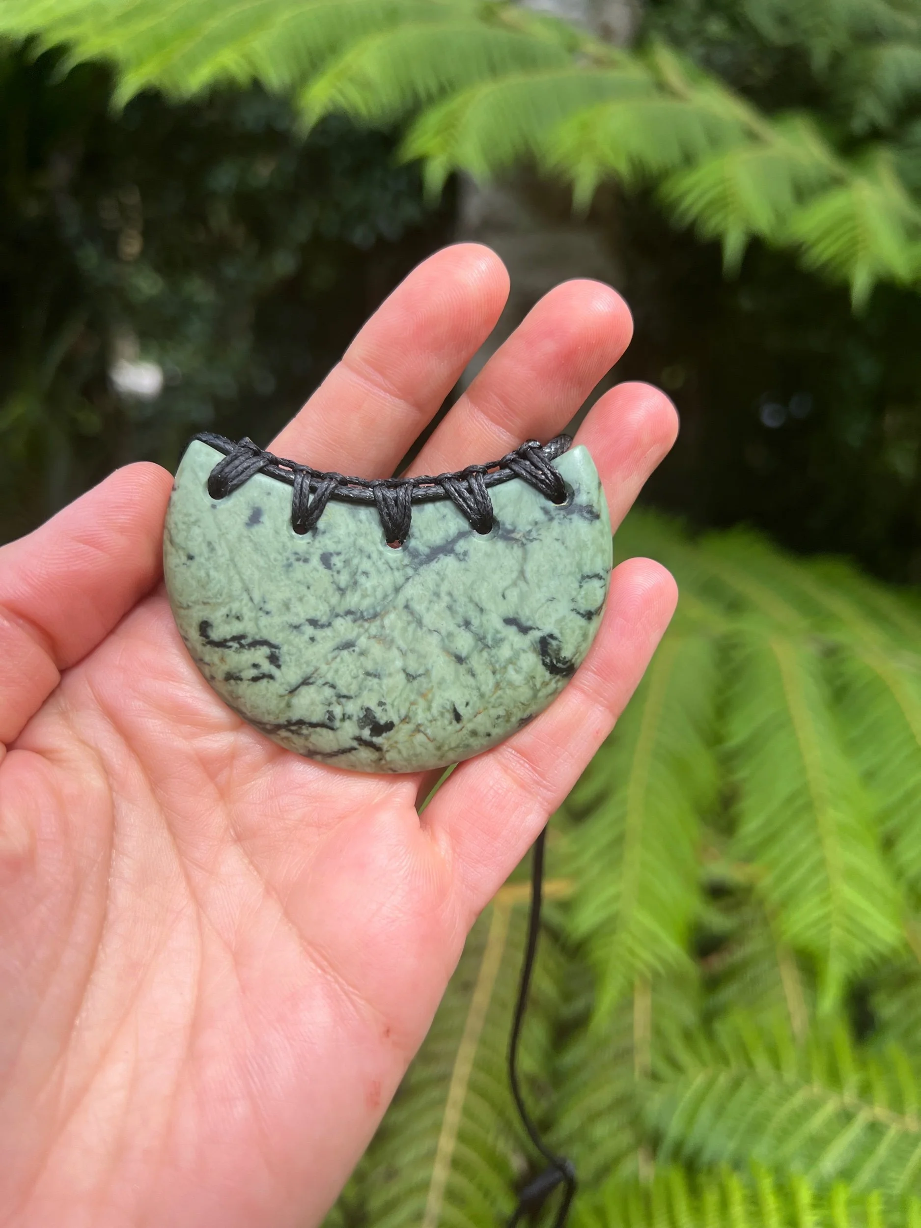 This piece is carved from the outer rim of Kawakawa Pounamu from the West Coast of New Zealand’s South Island. It has a light green base colour with black dots and natural patterns, giving it a distinctive character and making it a one-of-a-kind piece.