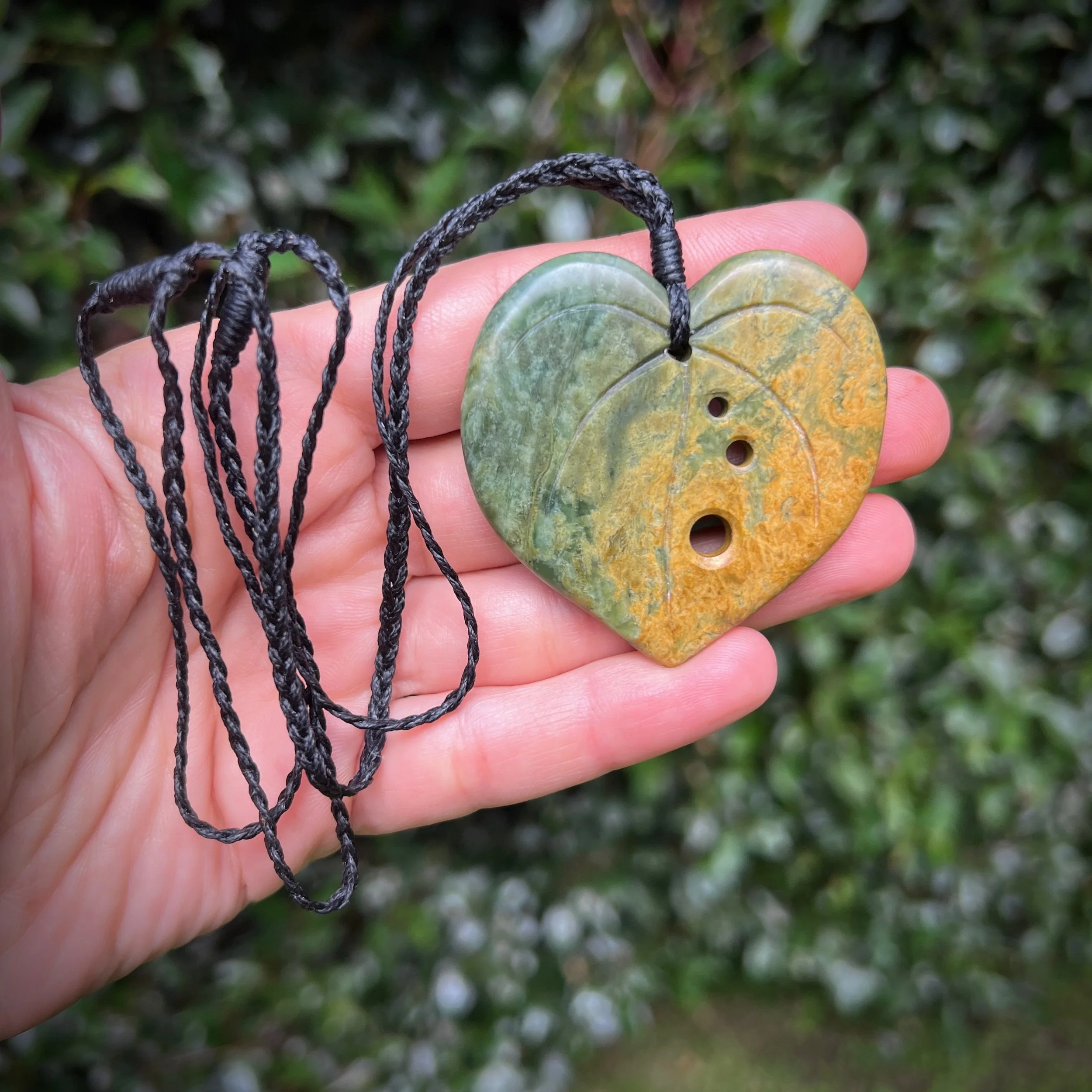 This piece is carved from the outer rim of Kawakawa Pounamu from the West Coast of New Zealand’s South Island. It has a light green base colour with black dots and natural patterns, giving it a distinctive character and making it a one-of-a-kind piece.